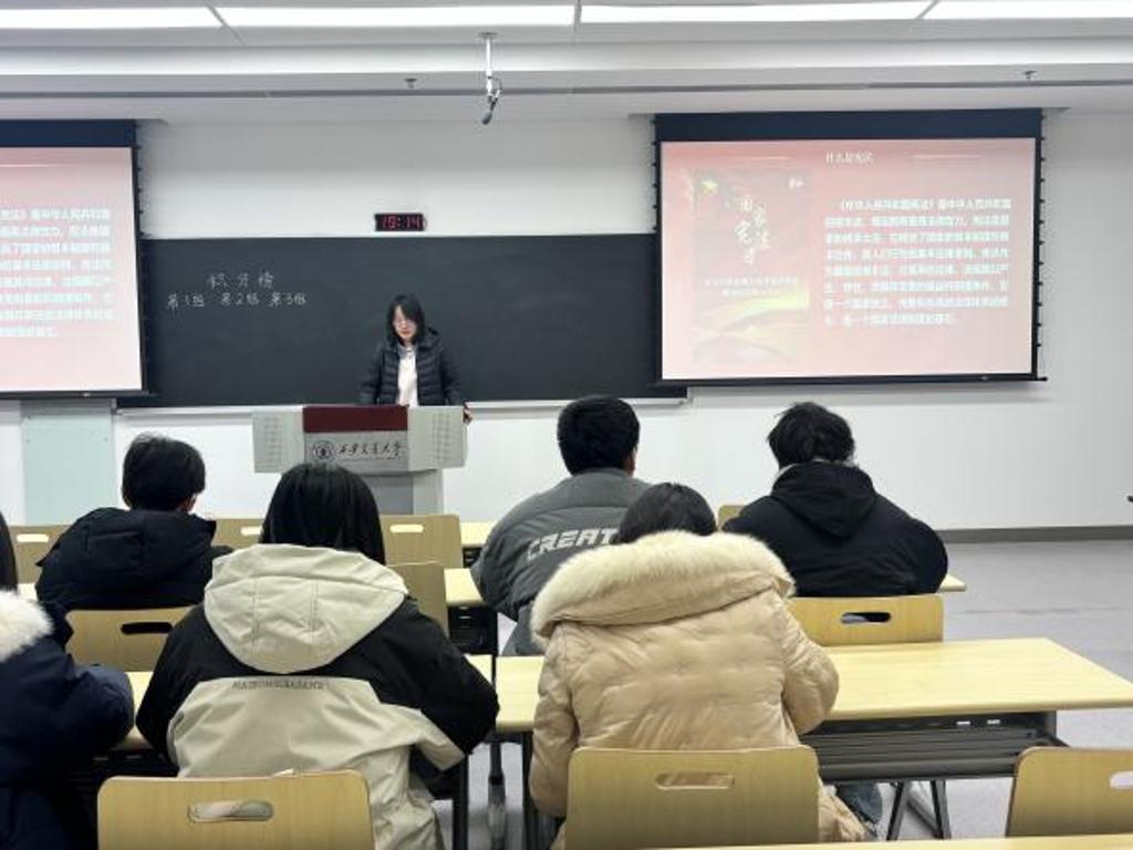 活动伊始,团支书刘彤同学带领大家一起了解和学习宪法。宪法是国家的根本大法,是治国安邦的总章程。它规定了国家的根本制度和根本任务,是人们行为的基本法律准则。从出生到老去,从受教育到就业,宪法时刻守护着我们的每一项权利。通过理论知识学习,同学们深刻认识到:“宪法作为国家的根本法,是其他法律、法规赖以产生、存在、发展和变更的基础和前提条件。”宪法不仅是庄严的法律条文,更是守护我们美好生活的坚实盾牌。