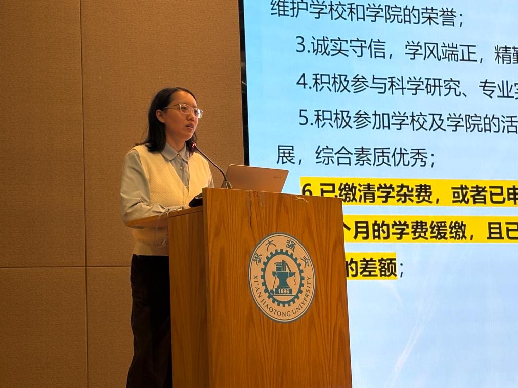 宋京恩老师为同学们系统解读了研究生奖助体系,包括各类奖助学金的申请条件和评审流程等内容。她指出,奖学金评选不仅关注学术成果,更注重综合素质,鼓励新生在学术科研、创新实践、社会服务等领域全面发展。