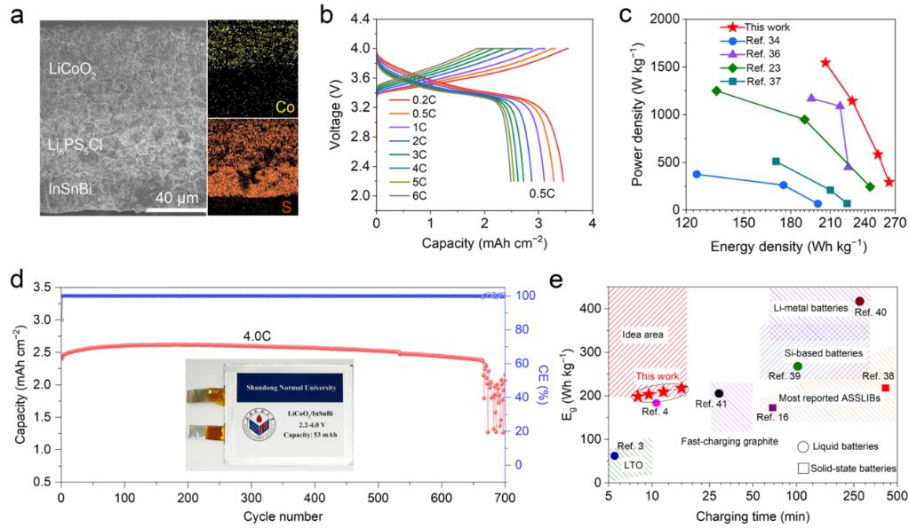 图2 全电池的电化学性能。a, InSnBi||LiPSCl||钴酸锂横截面SEM图像。b, 全电池从0.2 C到6 C的充放电曲线。c, 全电池与已报道全固态锂离子电池的比功率比较。d, 软包电池在4.0 C倍率下的循环性能。e, 该研究电池性能与代表性文献的快充能力比较。