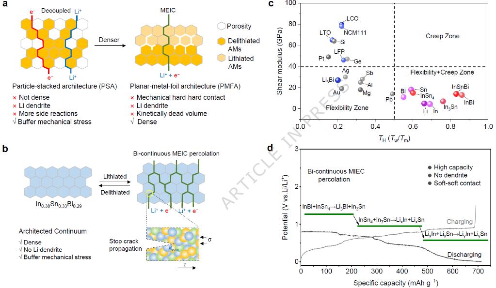 图1 构型化连续体合金负极设计的概念。a, 传统负极结构—颗粒堆积结构(PSA)和平面金属箔结构(PMFA)及其优缺点。b, 结合PSA和PMFA的优点设计了结构化连续体合金,该合金具有双连续混合离子电子传导和软-软接触以缓冲机械应力并阻止基于裂纹的退化。c, 各种材料在25°C下的变形机制图。d, InSnBi负极锂化过程