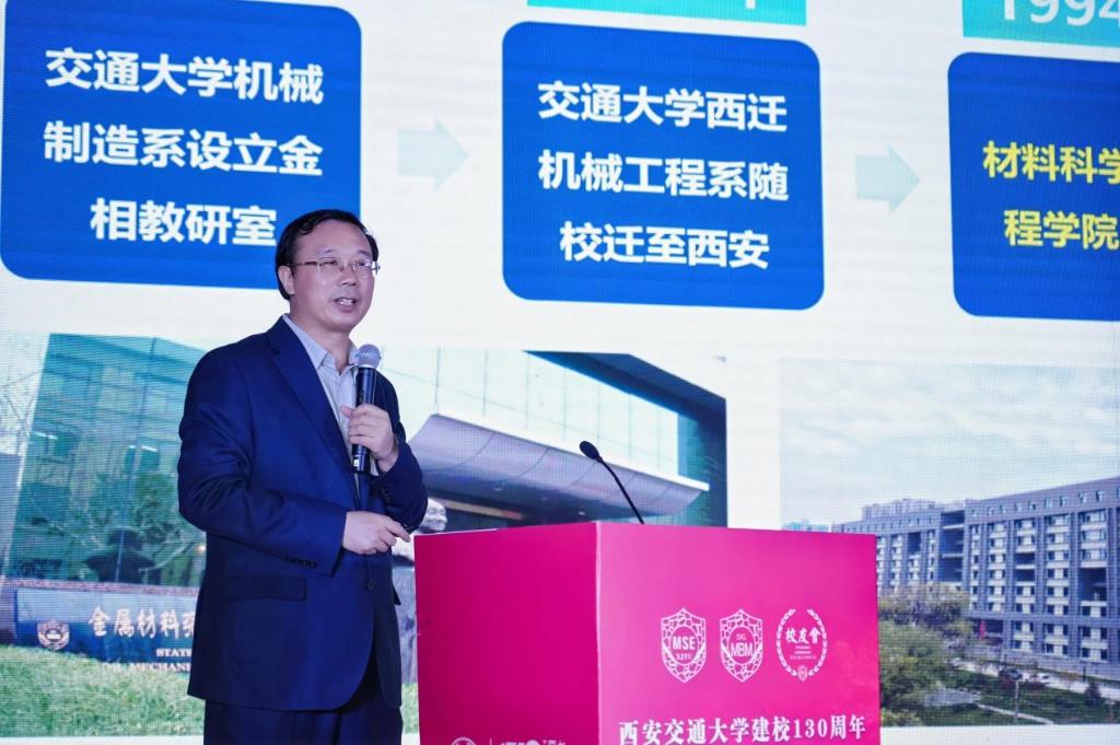 西安交大党委常委、副校长单智伟代表学校欢迎材料学院的校友们返校回家,向长期以来关心支持学院发展的各界同仁表示感谢,对材料学科校友会在信息收集、返校活动、成果转化、社会捐赠等方面的工作予以认可。他表示,校友是学校的宝贵财富,是支持学校事业发展的重要力量,希望各位校友站在百卅校庆的新起点上,与母校携手并肩、砥砺前行,在科研合作、成果转化、国际交流等方面关心和支持母校,把西迁精神传承好,把材料学科建设好,把交大人的故事续写好;希望材料学科校友会进一步发挥好桥梁纽带作用,团结凝聚广大校友,奋力书写“校友-母校”协同发展的新篇章,为母校的建设发展贡献更多的智慧和力量。