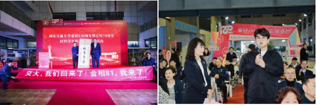1978级校友、金相81班班长靳新民作为代表,以书法作品《桃李芬芳》向母校表达最衷心的感谢,送上最真挚的祝福。材料学院2023级硕士研究生贾锡兵表示今后将在工作岗位上争做西迁精神新传人,把专业知识扎实运用到实际工作中,为材料强国贡献自己的青春力量。