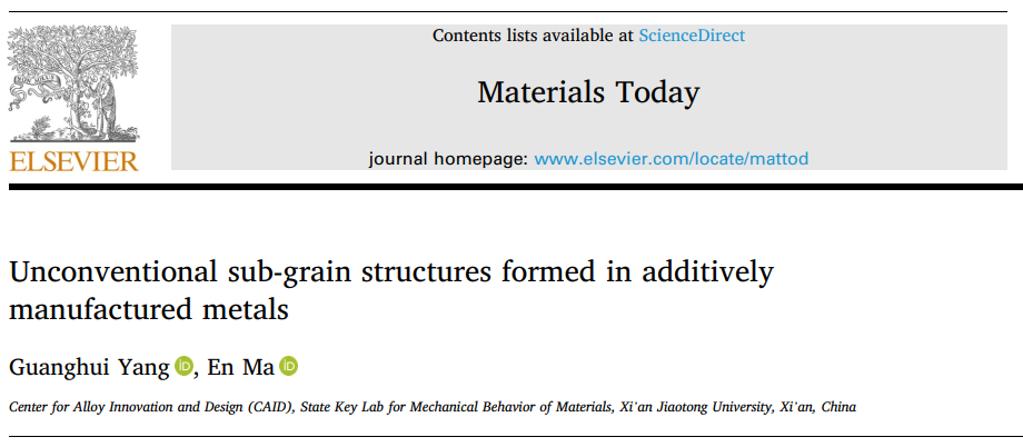 近日,材料学院材料创新中心(CAID)杨光辉助理教授与马恩教授对这一基础材料科学问题进行了系统研究。通过热力学、动力学分析,全面总结实验表征与数值模拟等方面的数据,完整地揭示了3D打印金属中胞状结构的演化路径,提出了位错胞形成的机制框架。相关成果以《增材制造金属中非常规亚晶结构的形成》(“Unconventional sub-grain structures formed in additively manufactured metals”)为题的综述论文发表在材料科学领域的顶级期刊《今日材料》(Materials Today,IF=22)上。西安交通大学材料学院杨光辉助理教授为论文第一作者,并与马恩教授同为通讯作者。
