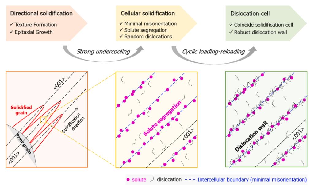 研究指出,3D打印过程中独特胞状结构的形成源于三个相互关联的关键过程(图1):定向凝固、凝固胞形成以及位错胞形成。在快速凝固与强温度梯度作用下,金属首先经历定向凝固;随后,由于溶质排斥与成分过冷,形成具有溶质偏聚特征的凝固胞;在此基础上,3D打印特有的反复热循环内应力诱发大量位错生成,这些位错在凝固胞的“模板”引导下重新组织排列,最终形成规则的位错胞网络(图2)。