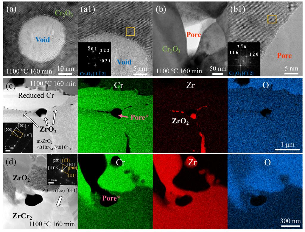 图2 在1100 ℃水蒸气中氧化160 min后Cr2O3及Cr涂层中孔洞结构特点: (a),(a1),(b),(b1) 纳米级和微米级孔洞结构,(c) Cr2O3-Zr氧化还原反应引发Cr涂层晶界处形成孔洞,(d) 柯肯达尔效应导致Cr涂层/Cr-Zr扩散层界面形成孔洞