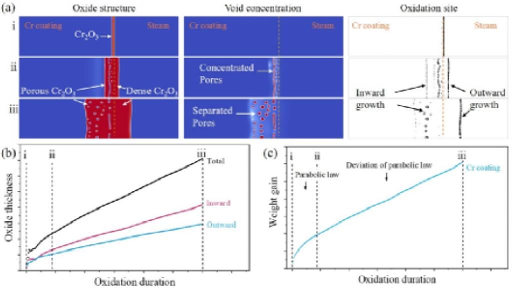 这种独特的动力学转变机制,核心源于“空位聚集-微孔合并-结构失效”的连锁效应:Cr涂层的小尺度特征尺寸(微米尺度的涂层厚度和晶粒尺寸)导致背应力升高,抑制界面位错运动,降低空位湮灭效率,促使Cr2O3内部形成微孔(图3);微孔不仅阻碍Cr阳离子向外扩散,还为氧离子提供快速扩散通道,引发氧化模式转变;后续Zr原子扩散引发的氧化反应与界面孔洞粗化,进一步破坏了涂层完整性,最终导致加速氧化。研究团队通过相场模拟,直观地演示了微孔演化与氧化动力学的耦合过程,进一步验证了微孔对涂层氧化行为的核心调控机制(图4)。
