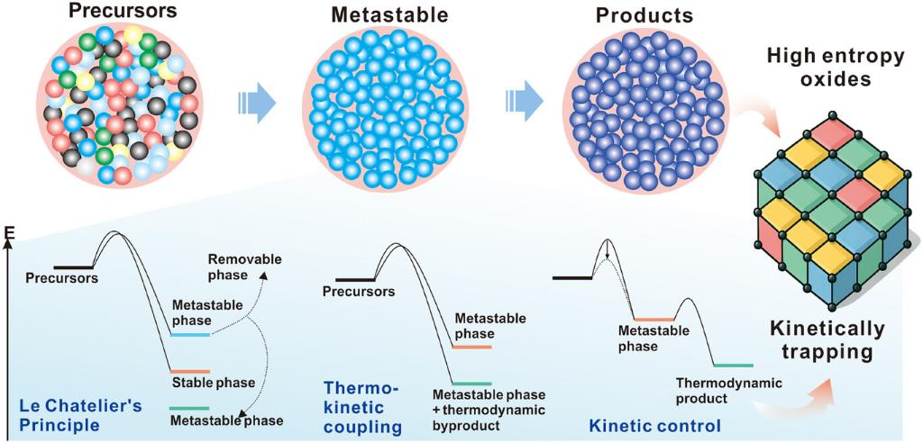 其次,文章以固相合成为例,揭示了非平衡条件下亚稳与高熵结构形成的基本物理机制。在高热输入作用下,多组分前驱体在短时间内实现高度混合,使体系优先进入高度无序的亚稳态;随后通过快速冷却,有效抑制扩散、相分离和长程有序化等慢动力学过程,使亚稳构型在跨越能垒之前被动力学俘获,从而保留高熵氧化物特有的无序结构。该过程并非改变热力学稳定性排序,而是通过时间尺度调控重构反应路径,凸显了非平衡固相合成在材料结构设计中的科学价值。