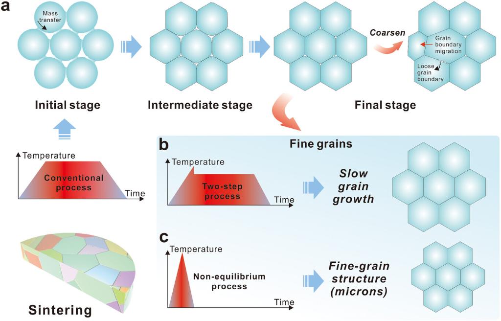 图1 固相烧结过程中致密化与晶粒长大之间热-动力学耦合及其解耦策略示意图。
