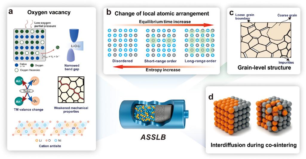文章进一步从多尺度结构演化的视角,系统阐明了非平衡制造对固态电池材料结构与性能的深远影响。在原子尺度上,超快热历程打破了缺陷向热力学平衡态充分重排的条件,使氧空位、反位缺陷及局域有序得以在可控范围内被“冻结”,从而调节离子迁移通道与电荷补偿机制。在晶界尺度,非平衡条件抑制了晶界充分迁移与重构,促成致密、非晶或异质晶界的形成,有效削弱电子泄漏与锂枝晶的优先生长路径。进一步在晶粒尺度上,致密化与晶粒长大之间的动力学解耦使细晶或多级结构得以保留,从而同步提升材料的力学稳定性与电化学性能。最终,在界面尺度,快速热处理显著缩短高温暴露时间,抑制正极活性材料与固态电解质之间的元素互扩散,明显降低反应层厚度与界面阻抗。整体而言,该多尺度分析揭示了非平衡制造如何通过结构调控跨尺度地重塑固态电池材料的性能边界。