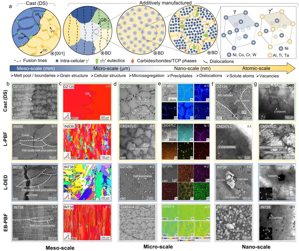 图 2 传统铸态定向晶与不同增材制造工艺制备镍基高温合金的显微组织结构对比。(a) 铸态定向晶组织及增材制造过程中形成的多尺度组织结构; (b-g) 不同打印态不可焊镍基高温合金的熔池形貌、晶粒形貌和晶体取向、枝晶组织、元素分布、析出相及位错结构