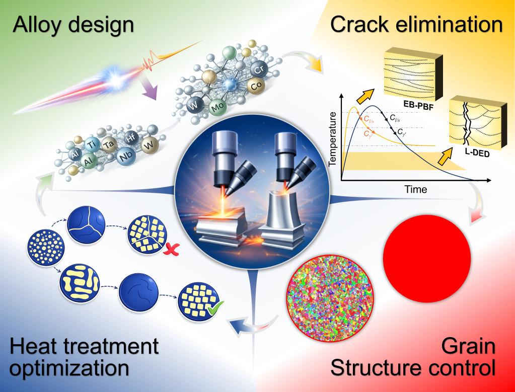 镍基高温合金因其在高温、高应力和复杂服役环境下仍保持优异的力学性能,被广泛应用于航空发动机、燃气轮机和能源装备等关键领域。这类合金通常依靠精密的化学成分设计和严格调控的显微组织结构来获得良好的高温强度、抗蠕变和抗疲劳性能。然而,传统高温合金构件主要通过铸造与机械加工等“等材”或“减材”方式获得,存在制造工序繁琐、生产周期长、产品合格率低等问题,且长期服役时难免受高温冲蚀、热交变载荷等因素影响产生损伤、导致失效。近年来,金属增材制造技术(即3D打印)的快速发展为高温合金复杂构件的制造及修复提供了全新的技术路径。通过逐层选区熔化、堆积成形,增材制造在工艺灵活性、材料利用率以及加工效率等方面展现出明显优势。然而,这一技术在实际应用中仍面临诸多挑战,例如打印过程中易产生热裂纹、晶粒组织难以精确调控,以及打印态组织对材料性能的影响机制尚不明确等问题。尤其对于高裂纹敏感性高温合金,如何在抑制冶金缺陷的同时,实现组织与性能的协同优化,是制约该领域发展的关键桎梏。