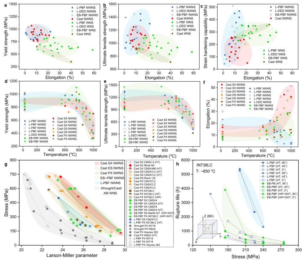 图 3 增材制造与铸造、锻造镍基高温合金的拉伸与蠕变性能对比。(a-c) 打印态高温合金与传统铸件室温拉伸时屈服强度、抗拉强度、加工硬化能力及延伸率的对比;(d-f) 不同温度下打印态不可焊高温合金和对应铸件的屈服强度、抗拉强度以及延伸率对比;(g) 典型铸造、锻造及增材制造镍基高温合金蠕变性能对比;(h) 打印态镍基高温合金IN738LC的蠕变各向异性