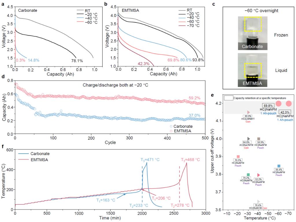 随着储能和动力电池技术的快速发展,钠离子电池因其资源丰富和成本优势,成为锂离子电池的重要补充体系。然而,钠离子电池在高电压(≥4.2 V)和极端温度(如−60 °C及以下)条件下仍面临严峻挑战:高电压下电解液易发生氧化分解,导致界面不稳定;低温下溶剂分子取向受限、离子–偶极相互作用增强,使离子传输动力学显著恶化。这些问题在高负载软包电池中更加突出,严重制约其实际应用与规模化发展。