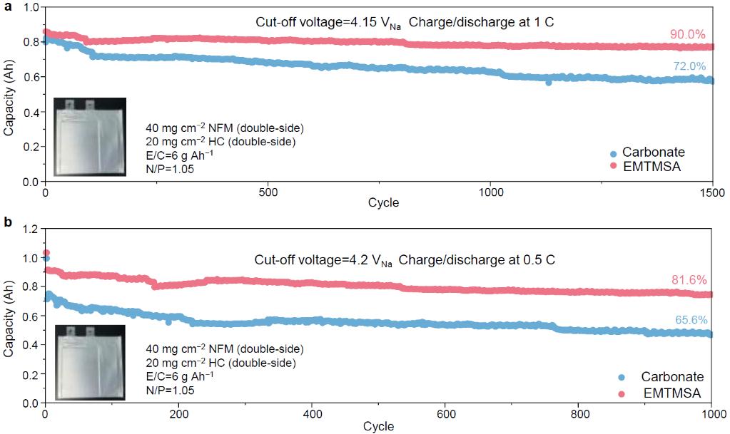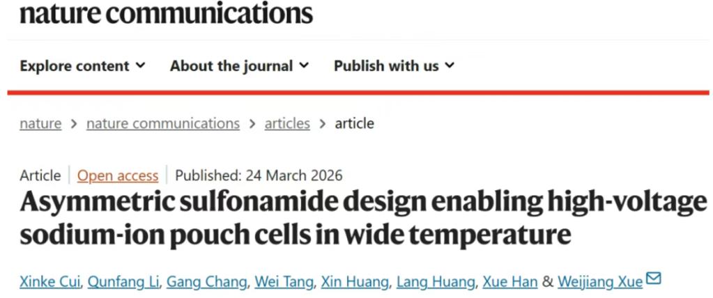 上述成果以《非对称磺酰胺分子设计实现高电压、宽温域钠离子软包电池》《Asymmetric sulfonamide design enabling high-voltage sodium-ion pouch cells in wide temperature》为题发表在国际著名期刊《自然通讯》《Nature Communications》。西安交通大学金属材料强度全国重点实验室为论文第一通讯单位,西安交通大学材料学院博士四年级学生崔新科为第一作者,材料学院薛伟江教授为通讯作者。该工作得到国家重点研发计划的资助和西安交通大学材料学院微纳中心和分析测试中心的鼎力支持。