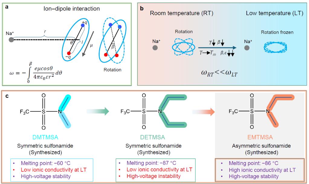 针对上述关键科学问题,西安交大材料学院金属材料强度全国重点实验室微纳中心薛伟江教授课题组提出了一种基于“分子不对称结构设计”的新型磺酰胺电解液分子——N-乙基-N-甲基三氟甲磺酰胺(EMTMSA)。通过在磺酰胺分子中引入不对称烷基取代基,打破凝固时分子晶体的规则堆积,使其熔点降低至−86 °C,从分子层面实现低温流动性与高电压稳定性的协同优化。同时,该分子保留了类盐结构特征,在溶剂化结构中诱导形成以接触离子对和聚集体为主的溶剂化鞘,氧化还原分解时促进构建富无机、低阻抗稳定界面。